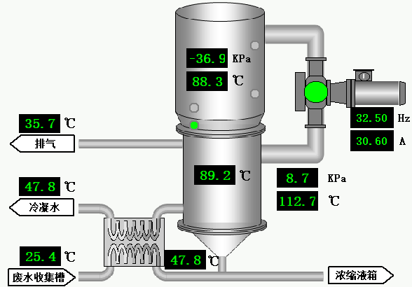 ③ 蒸發罐內為-35至55KPA(可設定)負壓條件運行,污水升溫至80-90攝氏度開始沸騰,產生大量水蒸汽。