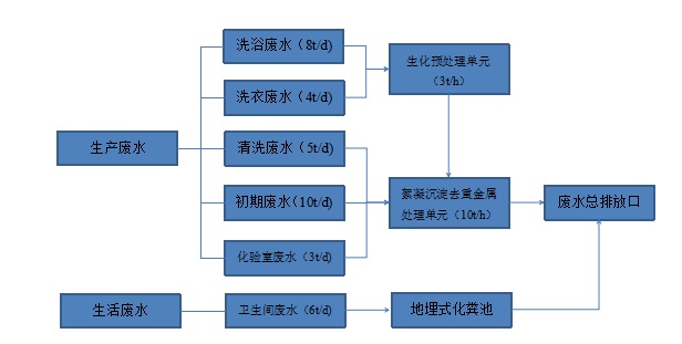 生產廢水按照可連續化運行模式進行設計,洗浴廢水和洗衣廢水單獨收集并采用AO生化預處理工藝后并入車間清洗廢水、初期雨水和化驗室廢水一起采用絮凝沉淀工藝去除重金屬。