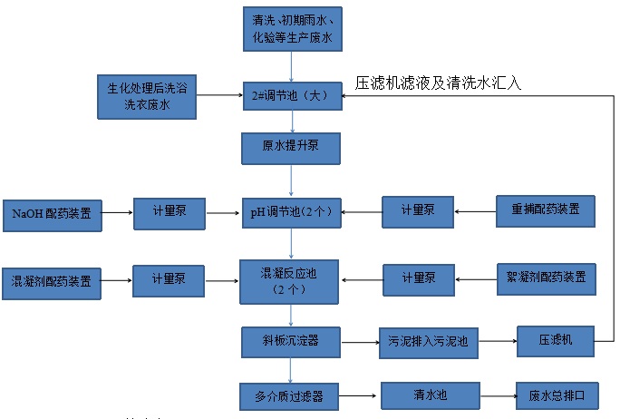 2)生產廢水重金屬工藝流程(絮凝沉淀工藝):