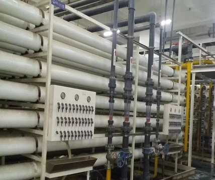 反滲透(RO膜系統(tǒng))是60年代發(fā)展起來的一項新的薄膜分離技術,是依靠反滲透膜在壓力下使溶液中的溶劑與溶質進行分離的過程。對于除鹽系統(tǒng)來說,預處理水進入反滲透膜,在高壓力的作用下,小分子(如水分子)透過半透膜進入淡水室,大分子(如 Ca2+、Mg2+、Na+、SO42-、Cl-、HCO3-、HSiO3- 等離子)則留在濃水室,后排放。反滲透系統(tǒng)控制自動控制,根據(jù)程序進行過濾產水、加藥、停機沖洗。