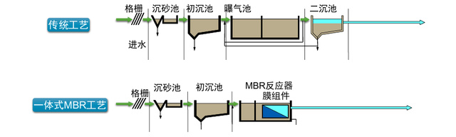 下圖是傳統(tǒng)活性污泥工藝與MBR工藝的對比: