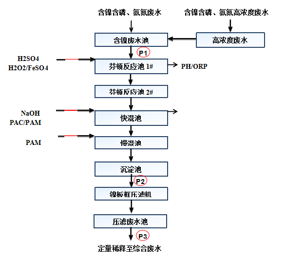 含鎳含磷、氨氮廢水通過提升泵提升至芬頓反應池1#和芬頓反應池2#,加入稀硫酸溶液、硫酸亞鐵與雙氧水,硫酸投加量由pH儀表自動控制,在酸性條件下通過強氧化劑的氧化作用進行氧化破絡與分解部分有機物;芬頓反應后的廢水溢流入快混池和慢混池,在快混池中加入NaOH溶液和PAC溶液,NaOH投加量由pH儀表自動控制,在慢混池中加入PAM溶液,經助凝反應后的含鎳廢水流入沉淀池進行固液分離,沉淀池的污泥經板框壓濾機壓濾,壓濾液獨立收集,定量稀釋到綜合廢水收集池進行下一步反應。